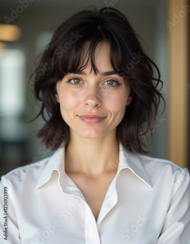 A poised beautiful woman with dark hair, wearing a white shirt, smiles warmly, standing in contemporary office setting filled with natural light, exuding confidence and professionalism. Generative AI.