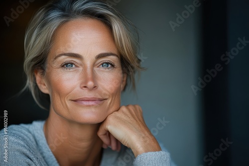 A poised older woman, her grey hair delicately styled, gazes confidently from a dark background. Her serene smile and gracefully aged features highlight her inner strength.