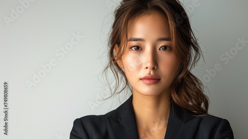 A poised young asian businesswoman with flowing hair wearing a stylish elegant suit, embodying confidence and professionalism on white background.