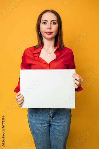 A portrait of a beautiful young Caucasian woman shows a white blank billboard on a yellow isolated background. Copying space.