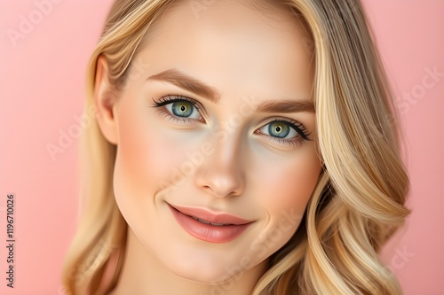 A portrait of a blonde haired woman with a bright face and blue eyes.