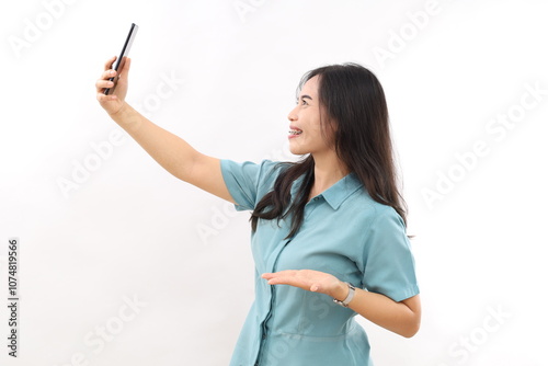 A portrait of a happy Asian woman wearing casual shirt and holding her phone, isolated by white background.Take selfie photo or video call with open palm showing something
