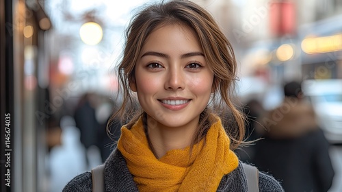 A portrait of a woman traveling in a city with buildings in the background, smiling confidently, represents vacations, holiday trips, and tourism.