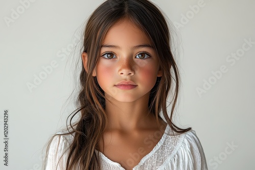 A portrait of a young girl with long hair, gazing directly at the camera with a serene expression.