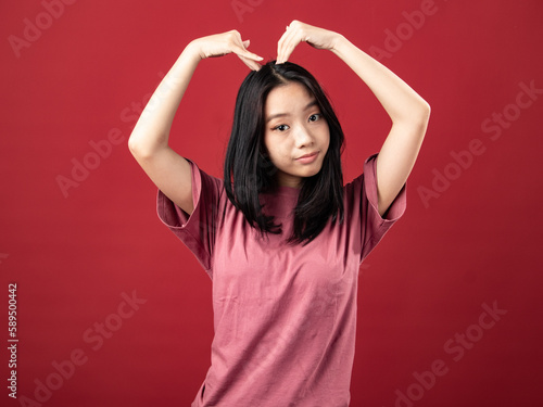A portrait of a young Indonesian (Asian) woman wearing a pink shirt, making a heart sign with both hands connected above her head. Isolated with a red background
