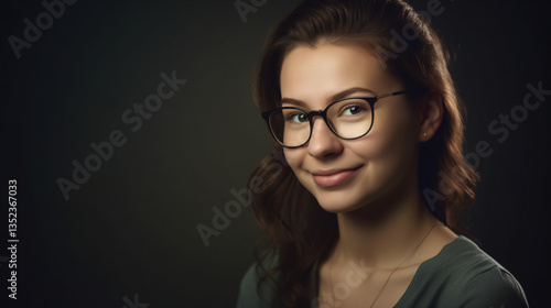A portrait of a young woman wearing glasses, smiling, and looking tech-savvy, perfect for a modern wallpaper.