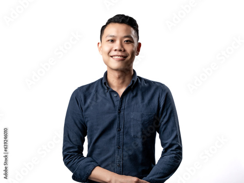 A portrait of an Asian man wearing a blue shirt, standing in a confident pose. Isolated with a white background.