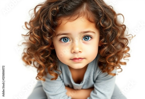 A portrait of an Asian toddler with curly brown hair and bright blue eyes