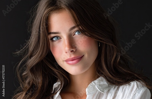 a portrait of an attractive young woman with long brown hair, wearing a white blouse and makeup