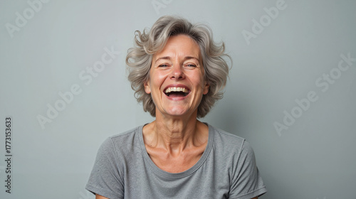 A portrait of an elderly woman with gray hair. She is smiling widely and appears to be laughing. She has a big smile on her face and her eyes are closed.