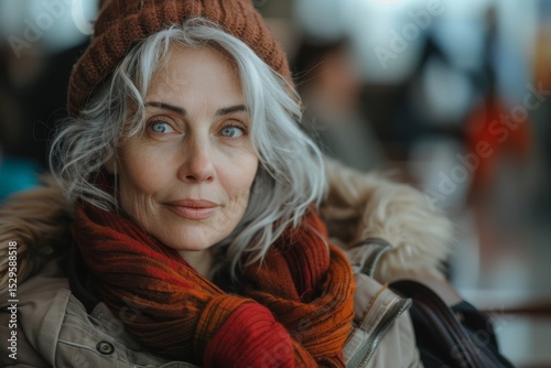 A portrait of an elegant older woman with silver hair wearing a cozy sweater and scarf, radiating confidence and grace in a bustling environment.