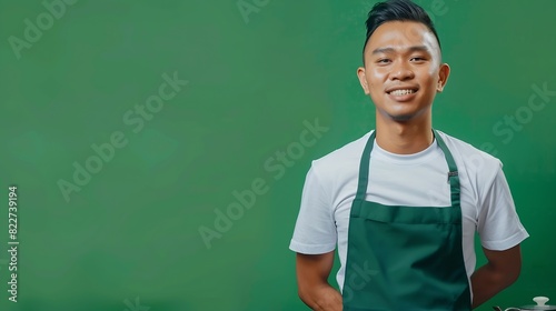 A portrait of an Indonesian Asian man wearing a white barista tshirt and a green apron looking happy and posing confidently isolated on a green background : Generative AI