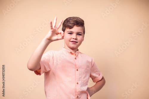 A portrait of kid boy showing okay gesture. Children and emotions concept