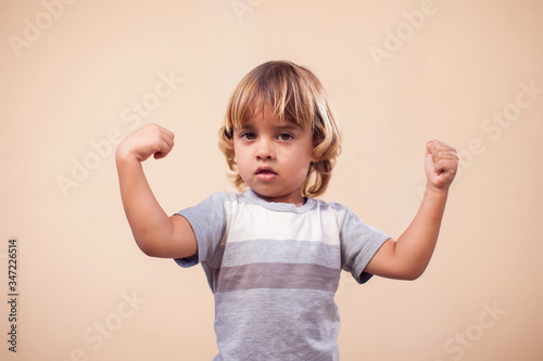 A portrait of kid boy showing strong hands. Childhood and health concept