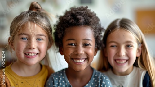 A portrait of three happy kids from different ethnicities, smiling brightly