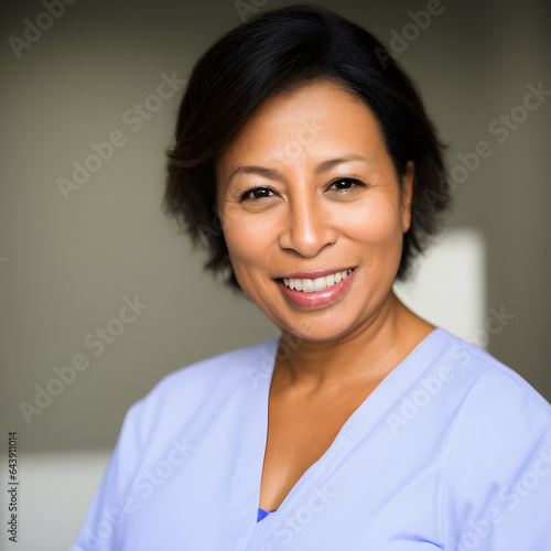A portrait photo of an attractive female middle aged mixed race nurse.