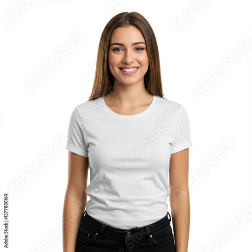 A pretty girl smiling standing wearing white t-shirt black jeans to create mockups templates