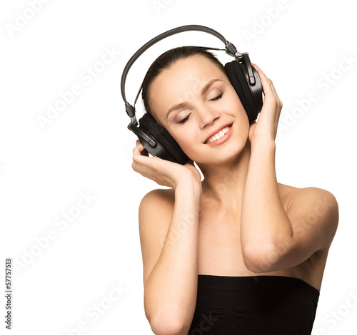 A pretty teenage girl listening to the music in headphones