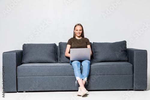 A pretty woman wearing casual clothes with laptop sit on sofa isolated on white background