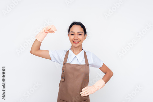 A pretty young asian housekeeper flexing her biceps, showing strength and dependability. Isolated on a white background.