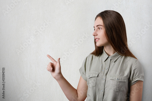A pretty young girl with long dark hair, nice eyes and charming smile standing sideways on grey background wearing grey T-shirt pointing with her finger at something. A girl looking into distance.