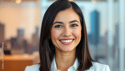 A professional businesswoman standing with her arms straight across an outdoor area. feeling happy , business and financial background