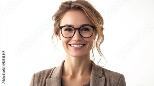 A professional portrait of a confident woman wearing glasses and smiling. She exudes warmth, intelligence, and trustworthiness, making her a perfect representation for education, business, or technolo