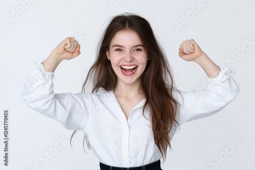 A professional studio portrait from the waist up of a girl on a light plain background, expressing pure joy with a radiant smile