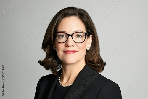 A professional woman in glasses, wearing a black suit, with styled hair, poses confidently against a neutral background.
