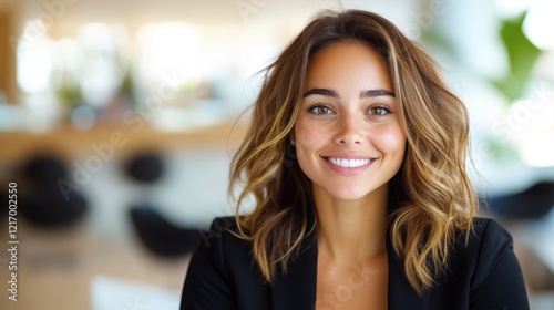A professional woman with a radiant smile stands confidently in an office space, reflecting both warmth and competence, ideal for business or career-related themes.