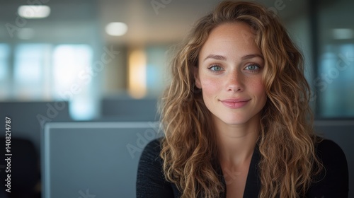 A professional young woman with curly hair smiles warmly, showcasing confidence and approachability in a modern office setting with a neutral background.