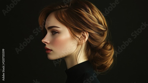 A profile shot of a woman with a graceful, poised demeanor, emphasizing her refined facial features and sophisticated hairstyle.