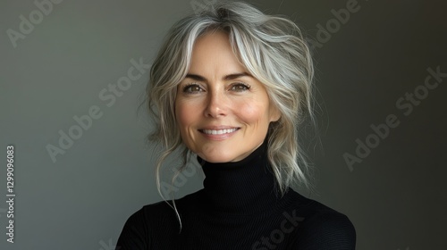 A profile view of an older woman with silver hair styled in a bun, wearing a black turtleneck.