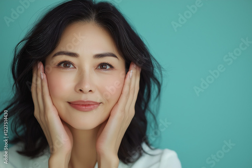 A radiant Asian woman in her late thirties smiles while gently touching her face with both hands against a light blue background. Captured in an advertising photography style, the image highlights.