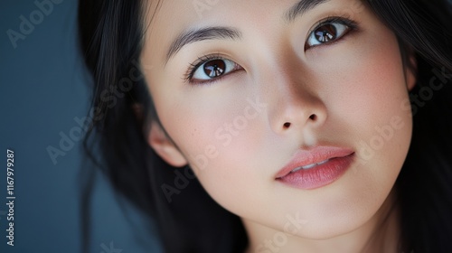 A radiant Asian woman with flawless skin and sparkling eyes, her moist lips adding to her natural charm, framed beautifully in a full-face close-up shot.