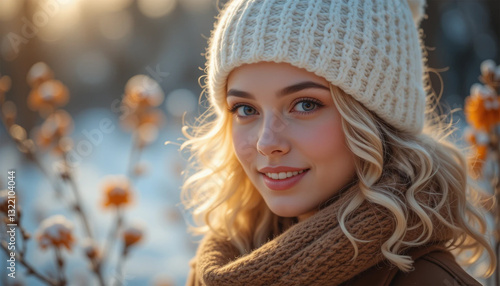 A Radiant Blonde Woman, Warmly Bundled In A Cozy Knit Hat And Scarf, Gazes Serenely Into The Winter Sunlight, A Gentle Smile Playing On Her Lips, Bathed In Soft Golden Light