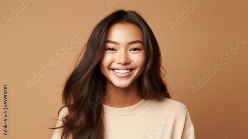 A radiant teenage girl stands before a soft, illuminated studio backdrop.