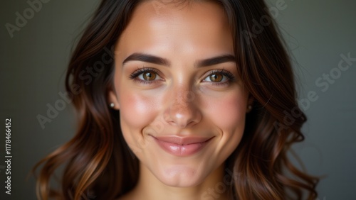 A radiant young woman gazes straight into the lens, her luscious dark brown locks framing her heart-shaped face, with a subtle hint of mischief in her eyes and a soft light brown glow on her eyelids