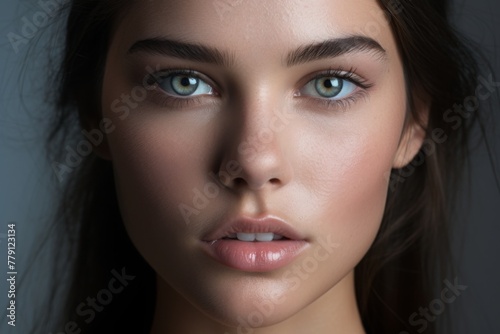 a realistic photo of a close-up of a model with skin imperfections smokey gray eyes, matching blush and bronzer