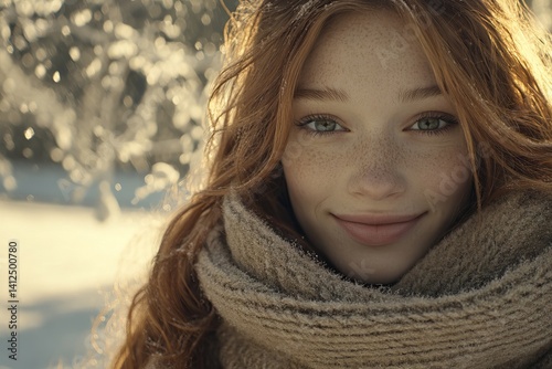 A red-haired girl with freckles is captured in a close-up portrait, laughing and looking at the camera over her shoulder, set against a sunset backdrop outside