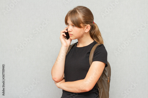 A schoolgirl in a black T-shirt and a backpack calls on the phone. Sad, worried child