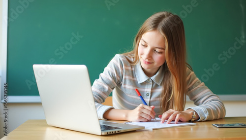 A schoolgirl writes in a notebook at a table with a laptop in a classroom with a chalkboard