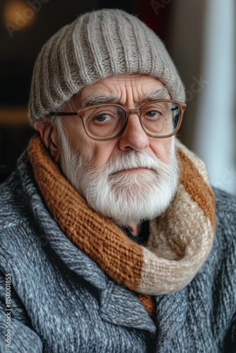 A senior man with a white beard and glasses, wearing a knitted hat and a cozy scarf. He has a serious expression and is dressed in a warm, textured coat.