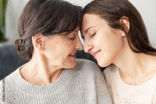 A senior mother and an adult daughter sitting on the comfortable couch face to face, a mom and a daughter touching foreheads with eyes closed. Family ties