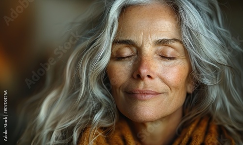 A serene elderly woman with long silver hair, eyes closed, smiles peacefully, embodying tranquility and graceful aging in a calm and gentle manner.