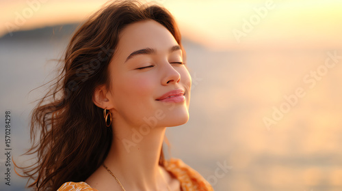 A serene woman enjoys the sunset by the sea, embodying peace and tranquility in a beautiful moment of connection with nature.