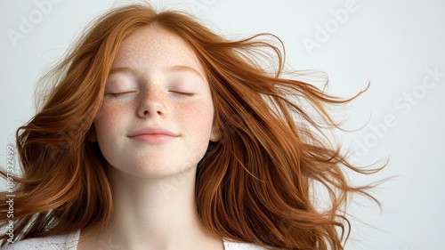 A serene young girl with flowing red hair enjoys a moment of tranquility, eyes closed, exuding a sense of peace and natural beauty.
