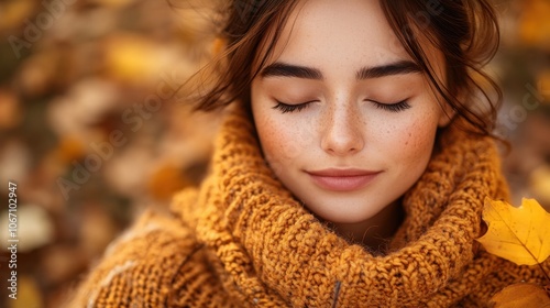 A serene young woman in a cozy knitted sweater enjoys the beauty of autumn leaves under a soft, golden glow