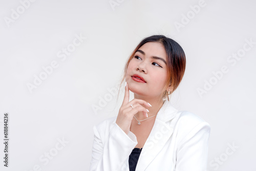 A serious and contemplating young woman with head tilted up and finger on her in a thinking gesture. Isolated on a white background.