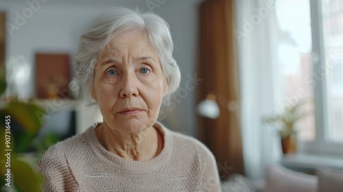 A serious elderly Caucasian woman with gray hair and blue eyes looks directly at the camera in her home.